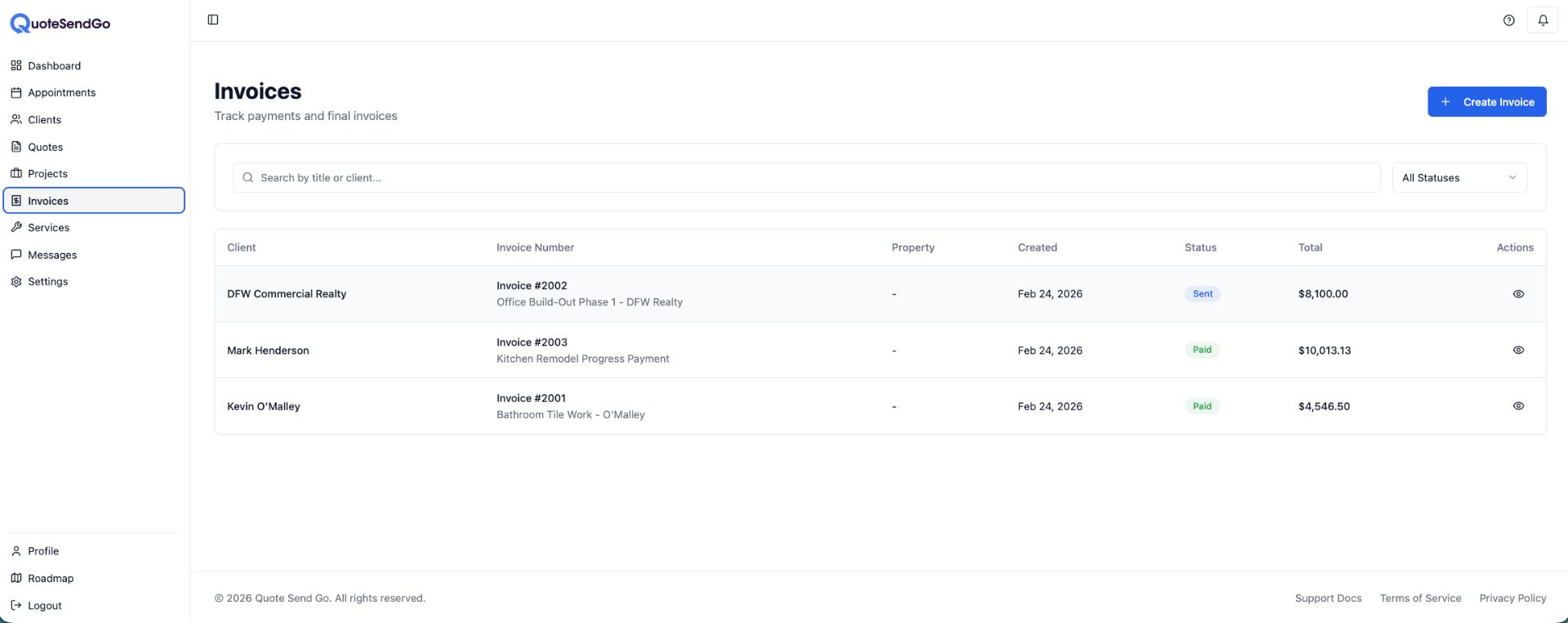 Invoice tracking shows you when invoices are viewed and when they're paid. Same concept as quote tracking — you always know where things stand.
